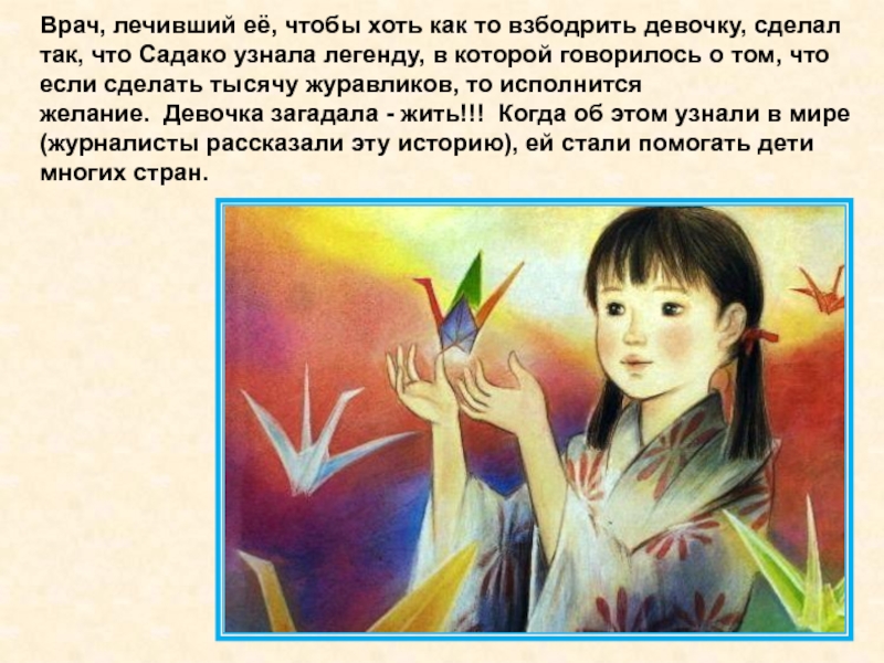 что если сделать тысячу журавликов, то исполнится желание. Девочка загадала - жить!!! Когда об этом узнали в мире (журналисты рассказали эту историю), ей стали помогать дети многих стран.