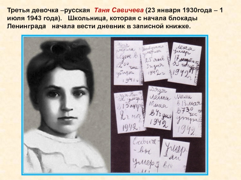 Слайд 39Третья девочка –русская Таня Савичева (23 января 1930года – 1 июля