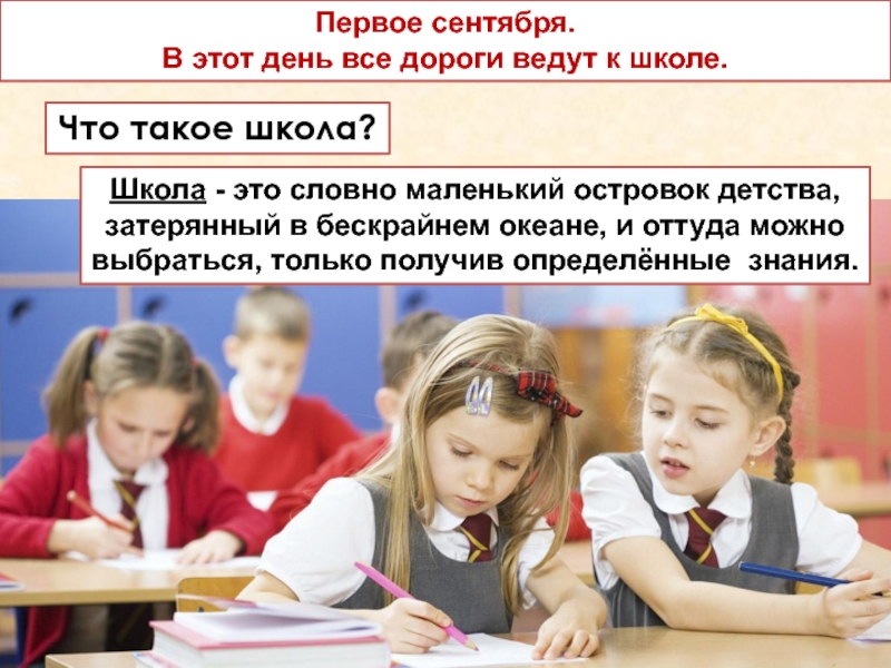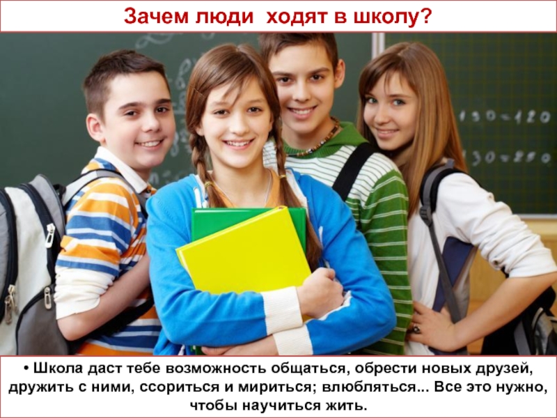 Слайд 20• В школу ходят, чтобы получать знания, без которых невозможно