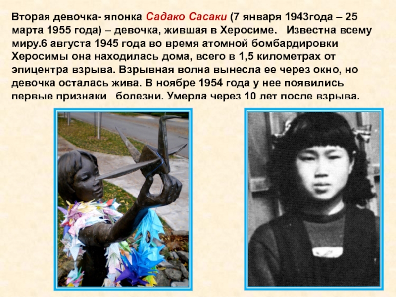 Слайд 36Вторая девочка- японка Садако Сасаки (7 января 1943года – 25 марта 1955