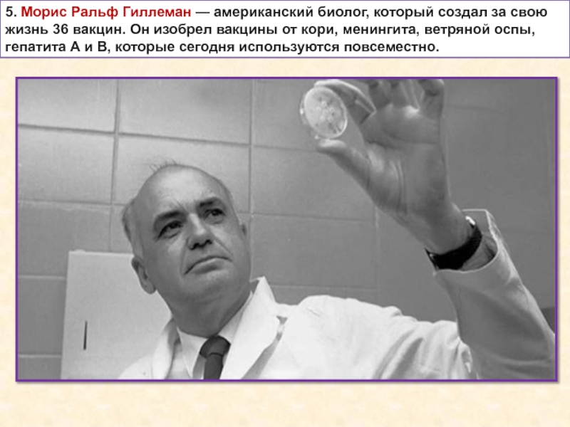 Слайд 545. Морис Ральф Гиллеман — американский биолог, который создал за свою