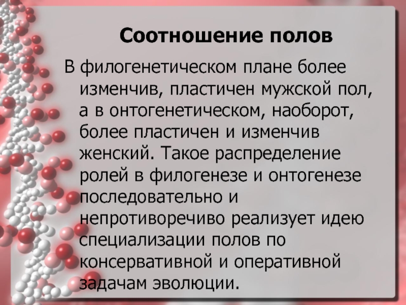 ролей в филогенезе и онтогенезе последовательно и непротиворечиво реализует идею специализации полов по консервативной и оперативной задачам эволюции.