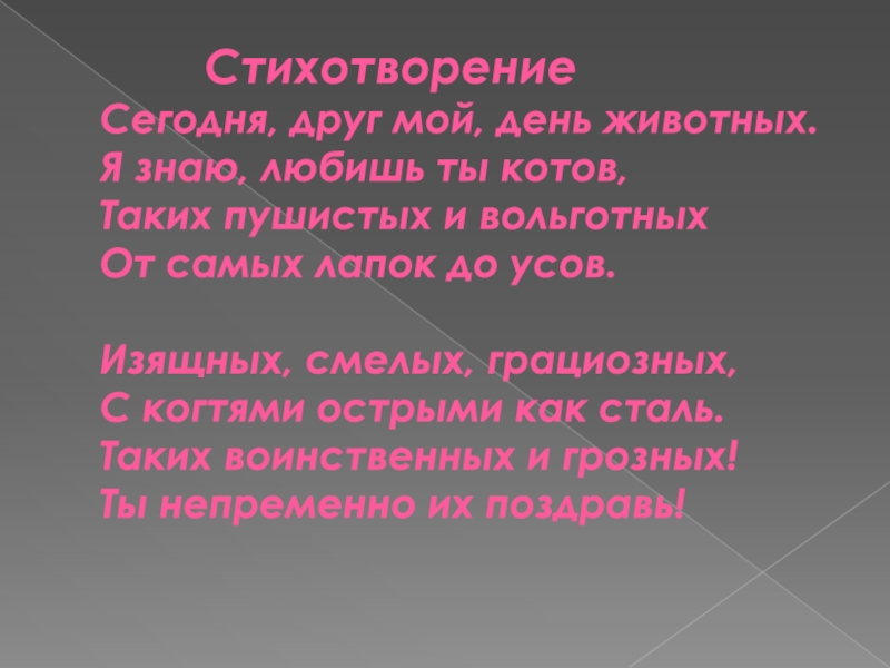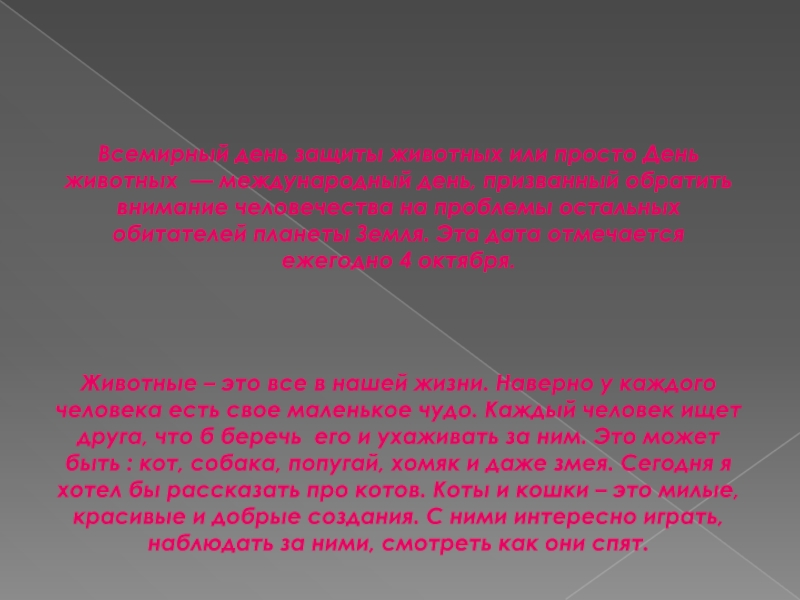 – это все в нашей жизни. Наверно у каждого человека есть свое маленькое чудо. Каждый человек ищет друга, что б беречь его и ухаживать за ним. Это может быть : кот, собака, попугай, хомяк и даже змея. Сегодня я хотел бы рассказать про котов. Коты и кошки – это милые, красивые и добрые создания. С ними интересно играть, наблюдать за ними, смотреть как они спят.