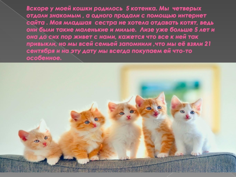 Слайд 7Вскоре у моей кошки родилось 5 котенка. Мы четверых отдали