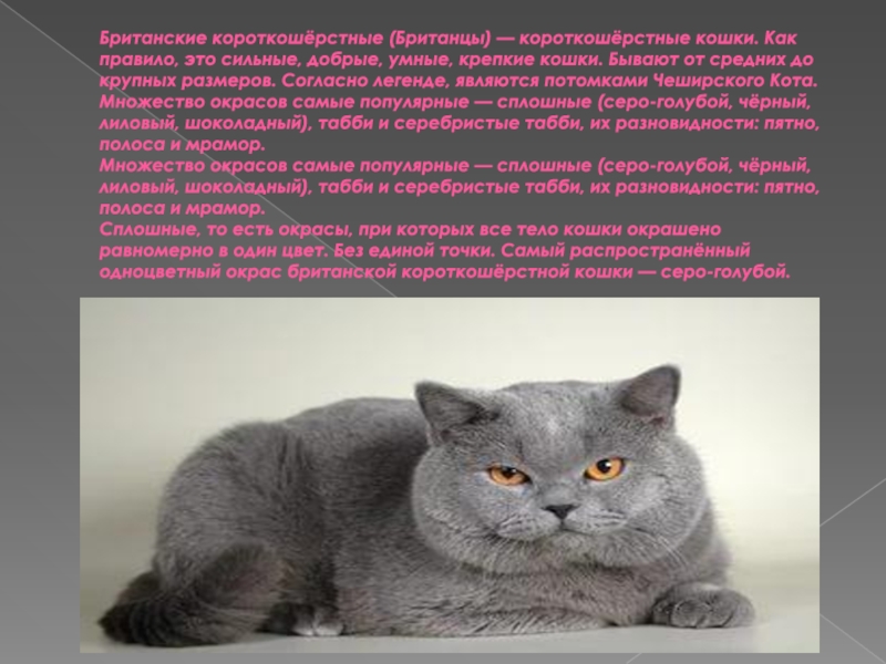 Слайд 10Британские короткошёрстные (Британцы) — короткошёрстные кошки. Как правило, это сильные, добрые, умные, крепкие