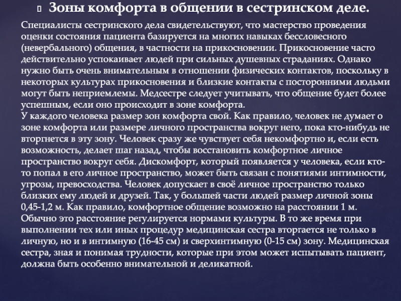 бессловесного (невербального) общения, в частности на прикосновении. Прикосновение часто действительно успокаивает людей при сильных душевных страданиях. Однако нужно быть очень внимательным в отношении физических контактов, поскольку в некоторых культурах прикосновения и близкие контакты с посторонними людьми могут быть неприемлемы. Медсестре следует учитывать, что общение будет более успешным, если оно происходит в зоне комфорта.
