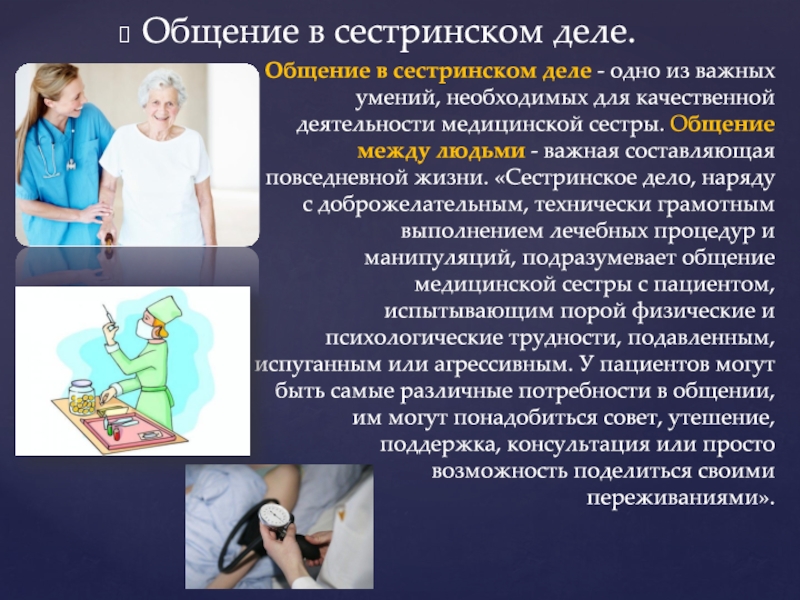 людьми - важная составляющая повседневной жизни. «Сестринское дело, наряду с доброжелательным, технически грамотным выполнением лечебных процедур и манипуляций, подразумевает общение медицинской сестры с пациентом, испытывающим порой физические и психологические трудности, подавленным, испуганным или агрессивным. У пациентов могут быть самые различные потребности в общении, им могут понадобиться совет, утешение, поддержка, консультация или просто возможность поделиться своими переживаниями».