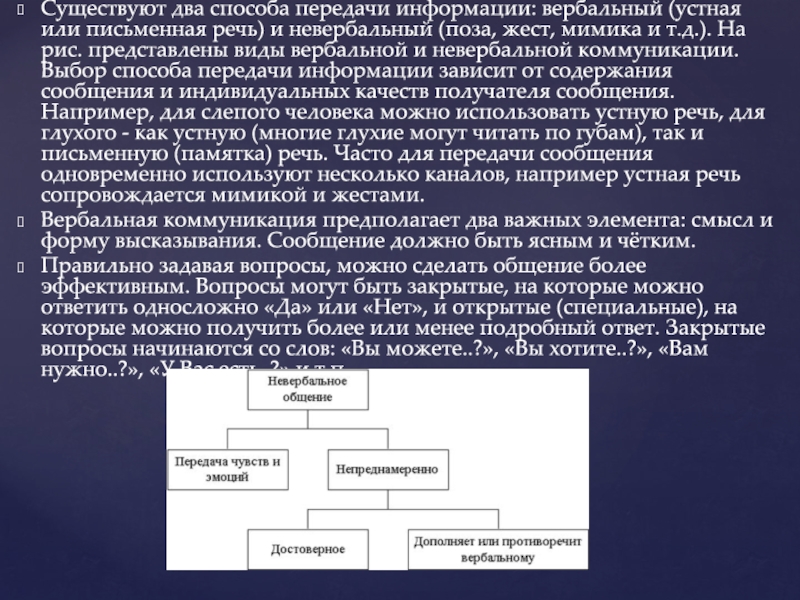 виды вербальной и невербальной коммуникации. Выбор способа передачи информации зависит от содержания сообщения и индивидуальных качеств получателя сообщения. Например, для слепого человека можно использовать устную речь, для глухого - как устную (многие глухие могут читать по губам), так и письменную (памятка) речь. Часто для передачи сообщения одновременно используют несколько каналов, например устная речь сопровождается мимикой и жестами.