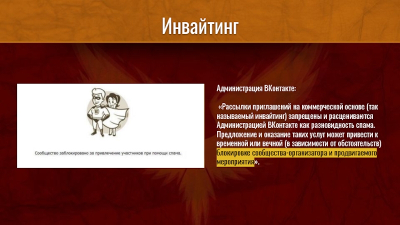оказание таких услуг может привести к временной или вечной (в зависимости от обстоятельств) блокировке сообщества-организатора и продвигаемого мероприятия».