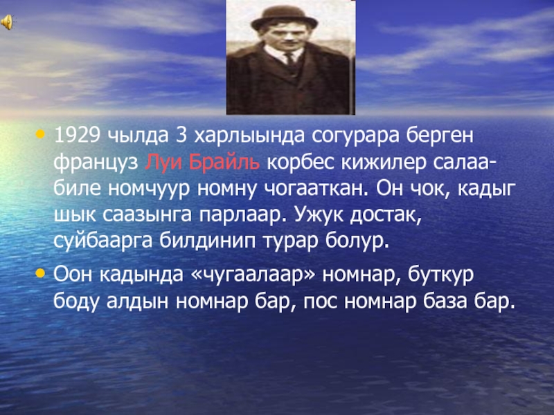 Слайд 201929 чылда 3 харлыында согурара берген француз Луи Брайль корбес