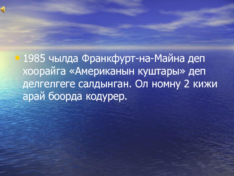 Слайд 181985 чылда Франкфурт-на-Майна деп хоорайга «Американын куштары» деп делгелгеге салдынган.
