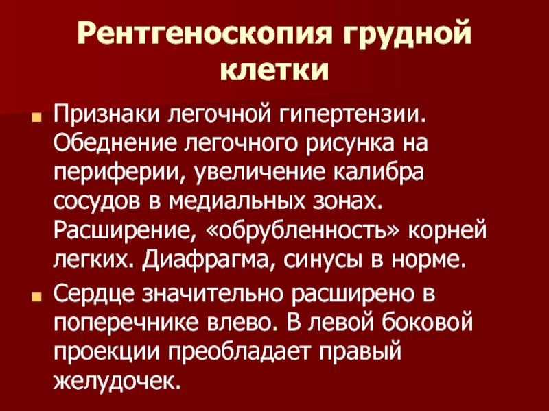 Признаки легочной гипертензии. Обеднение легочного рисунка на периферии,