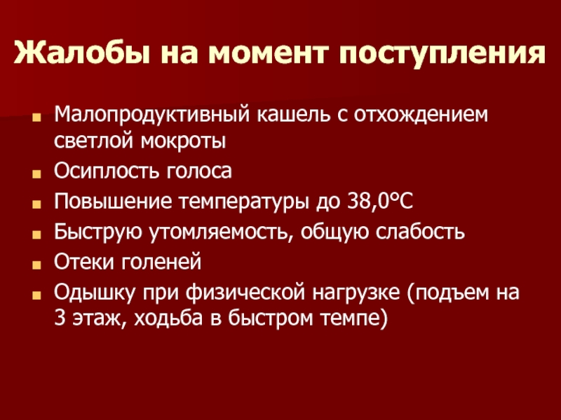 сухой кашель, осиплость голоса, повышение температуры тела до 37,5. 10 сентября утром вызвал бригаду СМП и был госпитализирован в пульмонологическое отделение КМСЧ № 1 с подозрением на пневмонию. По рентгенологическим данным диагноз пневмонии не подтвердился и для дальнейшего лечения 13 сентября пациент был переведен в кардиологическое отделение.