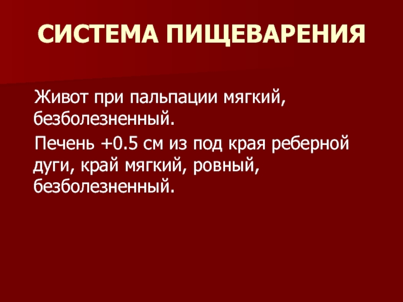 Печень +0.5 см из под края реберной дуги, край мягкий,