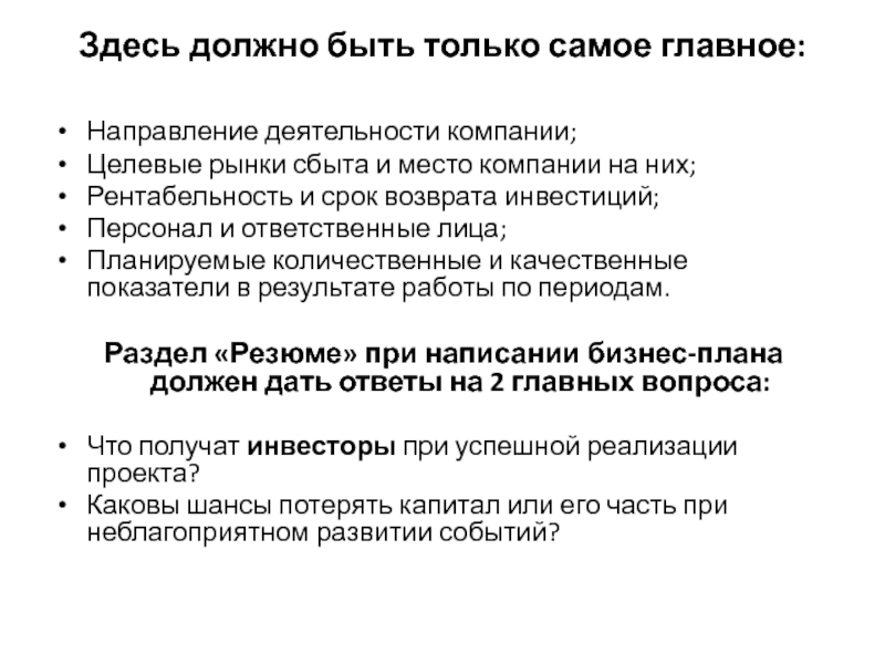 Раздел «Резюме» при написании бизнес-плана должен дать ответы на 2 главных вопроса: