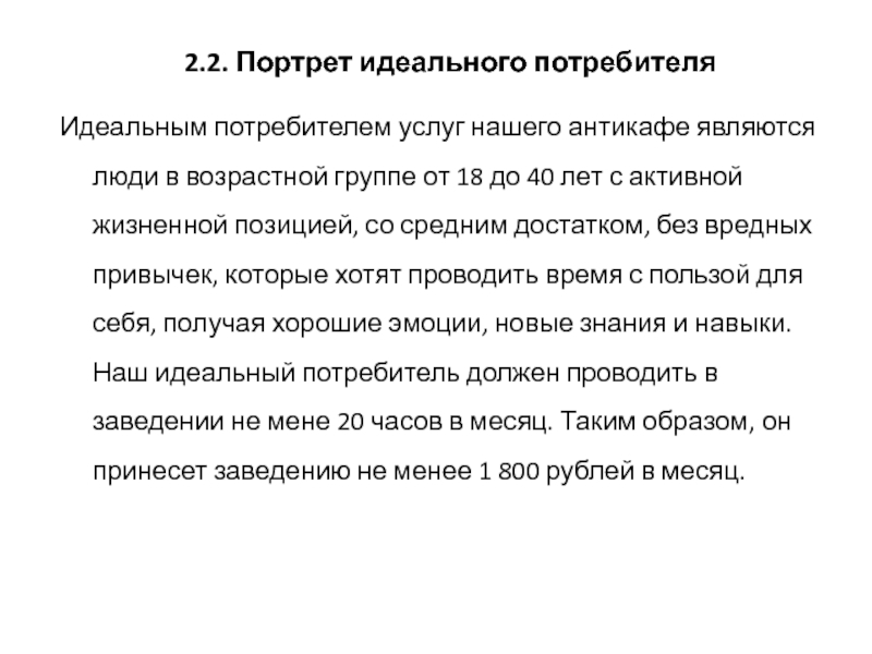 жизненной позицией, со средним достатком, без вредных привычек, которые хотят проводить время с пользой для себя, получая хорошие эмоции, новые знания и навыки. Наш идеальный потребитель должен проводить в заведении не мене 20 часов в месяц. Таким образом, он принесет заведению не менее 1 800 рублей в месяц.
