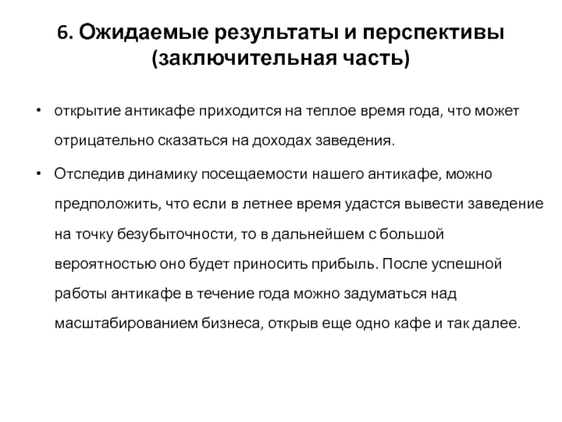 динамику посещаемости нашего антикафе, можно предположить, что если в летнее время удастся вывести заведение на точку безубыточности, то в дальнейшем с большой вероятностью оно будет приносить прибыль. После успешной работы антикафе в течение года можно задуматься над масштабированием бизнеса, открыв еще одно кафе и так далее.