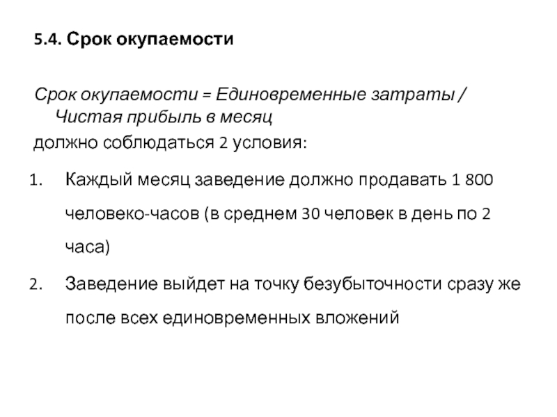 Заведение выйдет на точку безубыточности сразу же после всех единовременных вложений