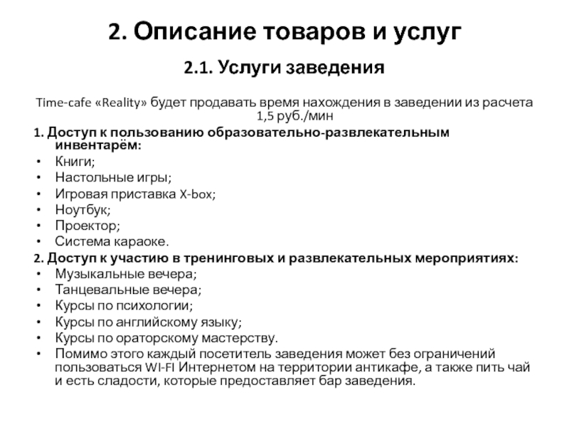2.1. Услуги заведения