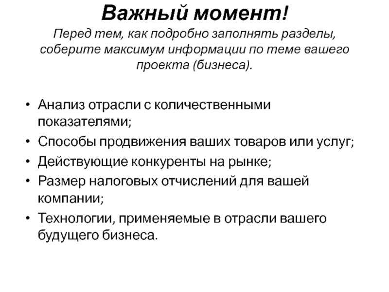 Перед тем, как подробно заполнять разделы, соберите максимум информации