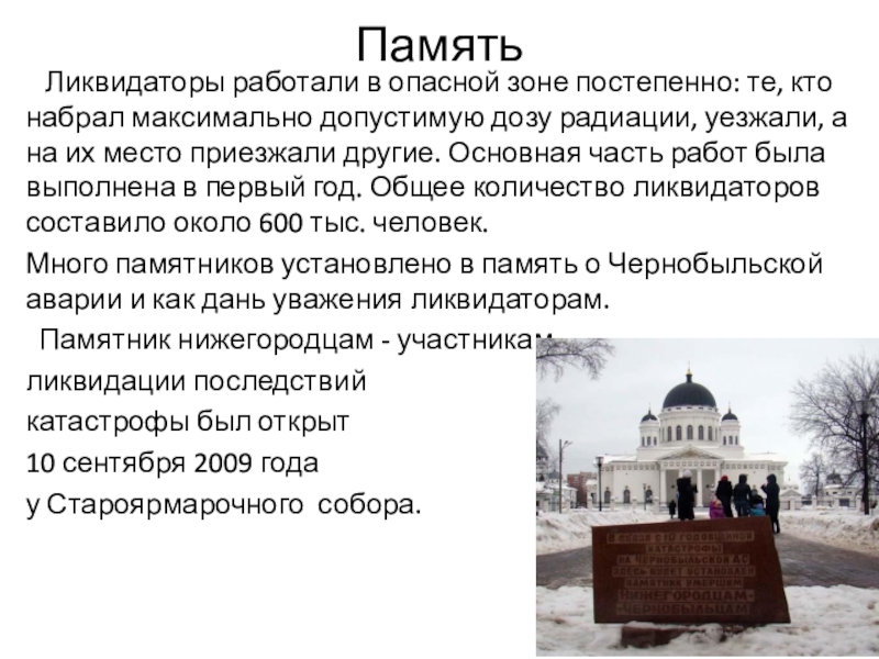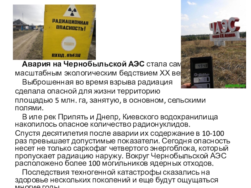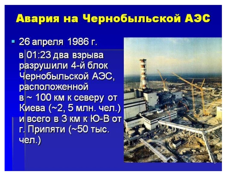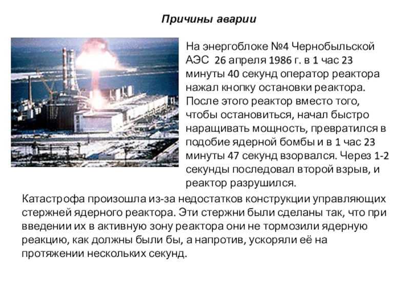 кнопку остановки реактора. После этого реактор вместо того, чтобы остановиться, начал быстро наращивать мощность, превратился в подобие ядерной бомбы и в 1 час 23 минуты 47 секунд взорвался. Через 1-2 секунды последовал второй взрыв, и реактор разрушился.Катастрофа произошла из-за недостатков конструкции управляющих стержней ядерного реактора. Эти стержни были сделаны так, что при введении их в активную зону реактора они не тормозили ядерную реакцию, как должны были бы, а напротив, ускоряли её на протяжении нескольких секунд.