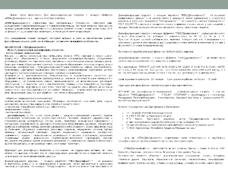 Дезинфицирующее средство с моющим эффектом "ПВК/Дезинфект+" не вызывает аллергических реакций и не накапливается в организме. После обработки препаратом, основное действующее средство (перекись водорода), полностью разлагается на Кислород и воду, не оставляя никаких остаточных действий.