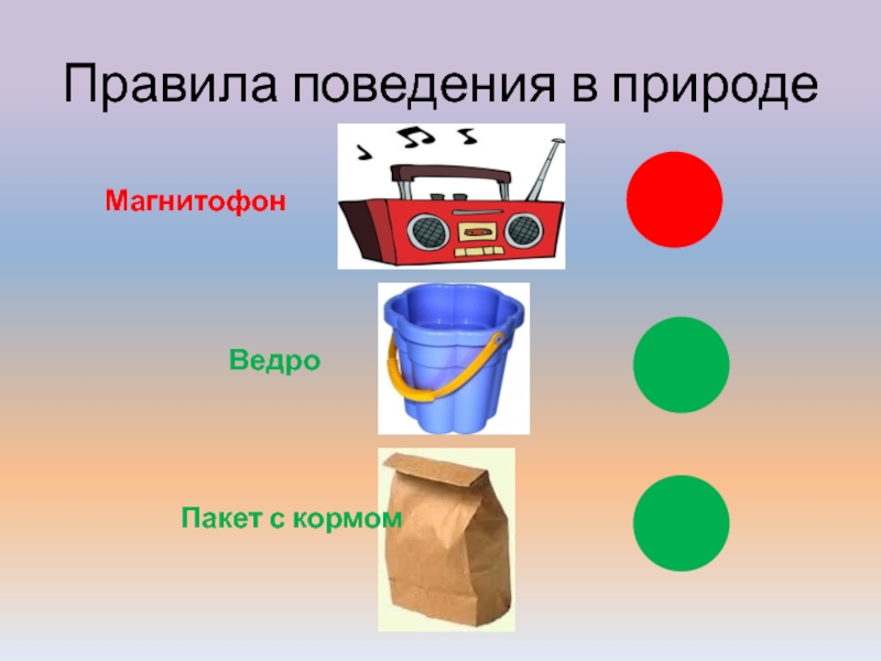 Правила поведения в природеМагнитофонВедроПакет с кормом