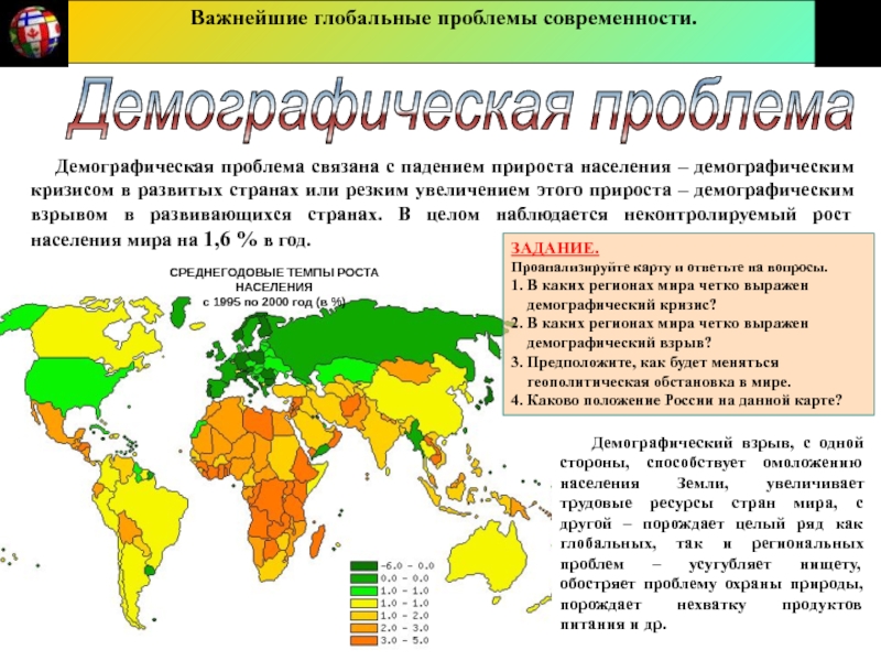 Смысл глобальной продовольственной проблемы заключается в опережающем росте численности населения по сравнению с ростом производства продуктов питания. В результате чего в мире происходит увеличение численности недоедающих и голодающих (ежегодно от голода, недоедания и связанных с ними болезней умирает 40 млн чел.), растет антропогенная нагрузка на сельскохозяйственные ландшафты, ухудшается качество продуктов питания, возрастает роль генной инженерии в решении продовольственной проблемы.