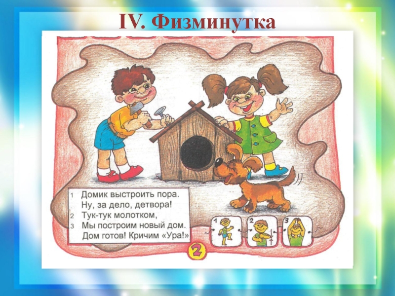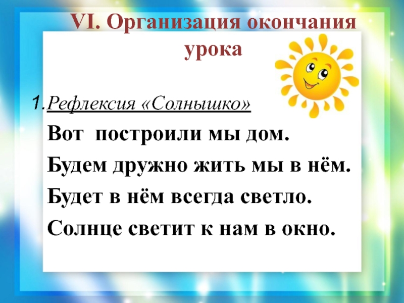VI. Организация окончания   урокаРефлексия «Солнышко» Вот построили мы дом. Будем дружно жить мы в нём.