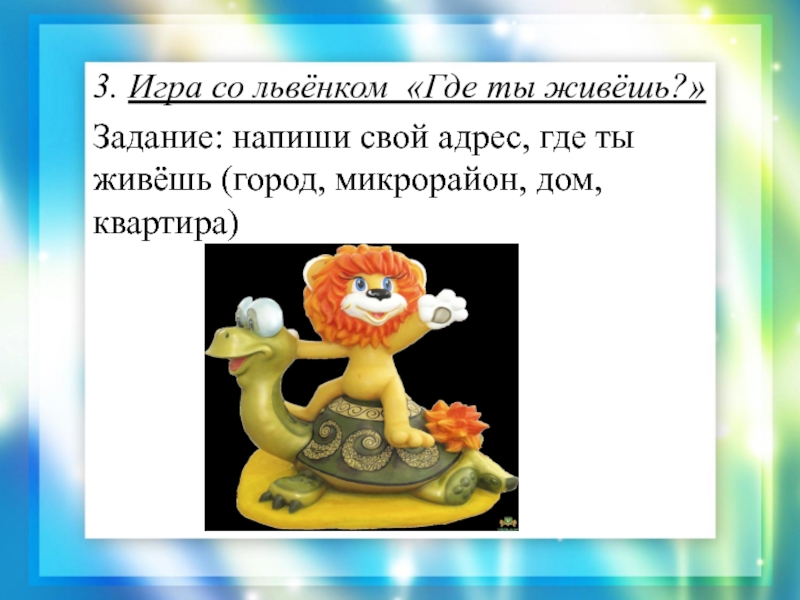 3. Игра со львёнком «Где ты живёшь?» Задание: напиши свой адрес, где ты живёшь (город, микрорайон, дом,