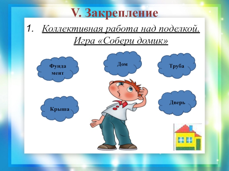 V. ЗакреплениеКоллективная работа над поделкой.   Игра «Собери домик» ФундаментКрышаДомТрубаДверь