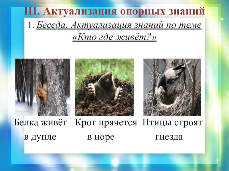 III. Актуализация опорных знаний  1. Беседа. Актуализация знаний по теме   «Кто где живёт?»