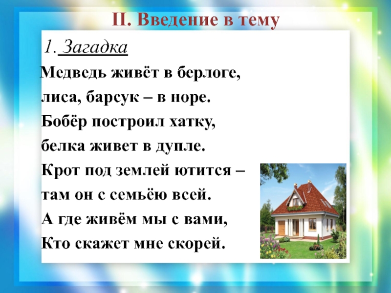II. Введение в тему   1. Загадка   Медведь живёт в берлоге,   лиса,