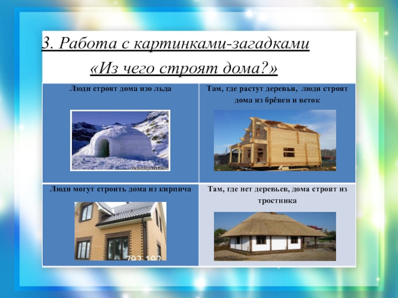 3. Работа с картинками-загадками        «Из чего строят дома?»