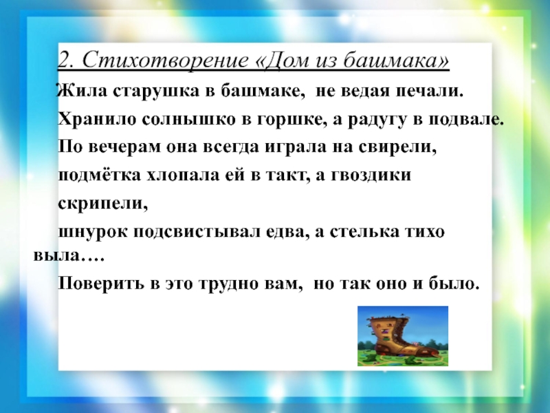 Слайд 9 2. Стихотворение «Дом из башмака»