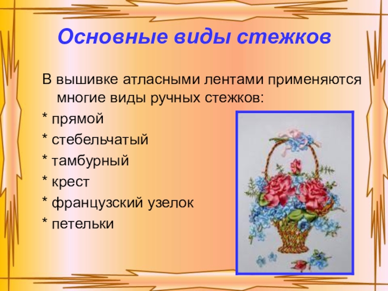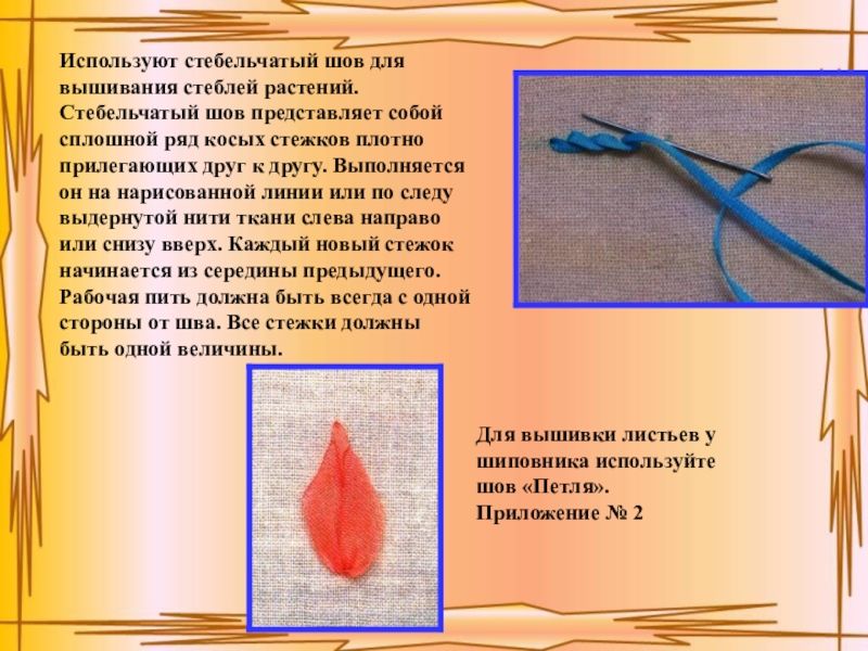 Слайд 29Используют стебельчатый шов для вышивания стеблей растений. Стебельчатый шов представляет