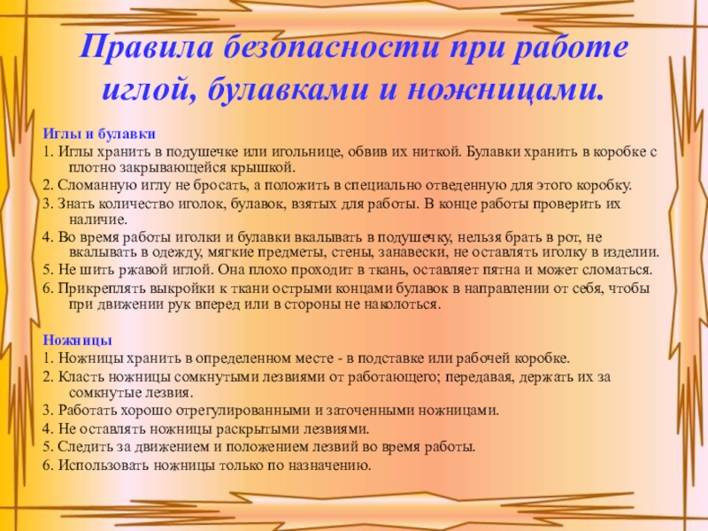 Слайд 23Правила безопасности при работе иглой, булавками и ножницами.