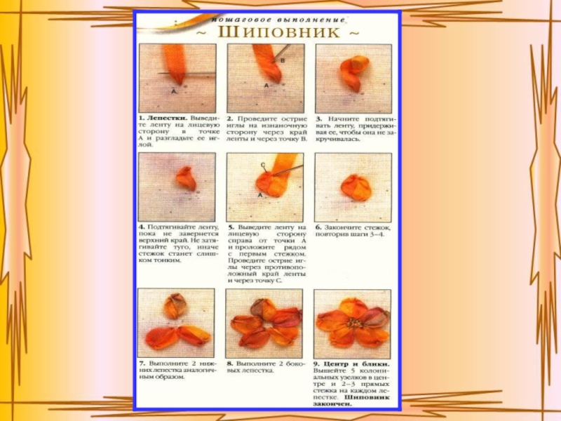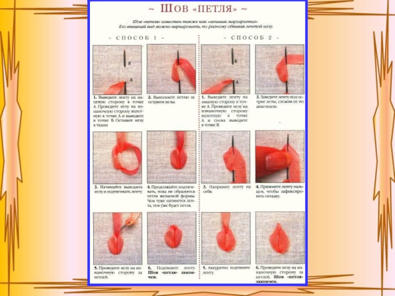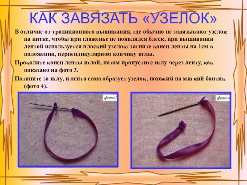 блеск, при вышивании лентой используется плоский узелок: загните конец ленты на 1см в положении, перпендикулярном кончику иглы.
