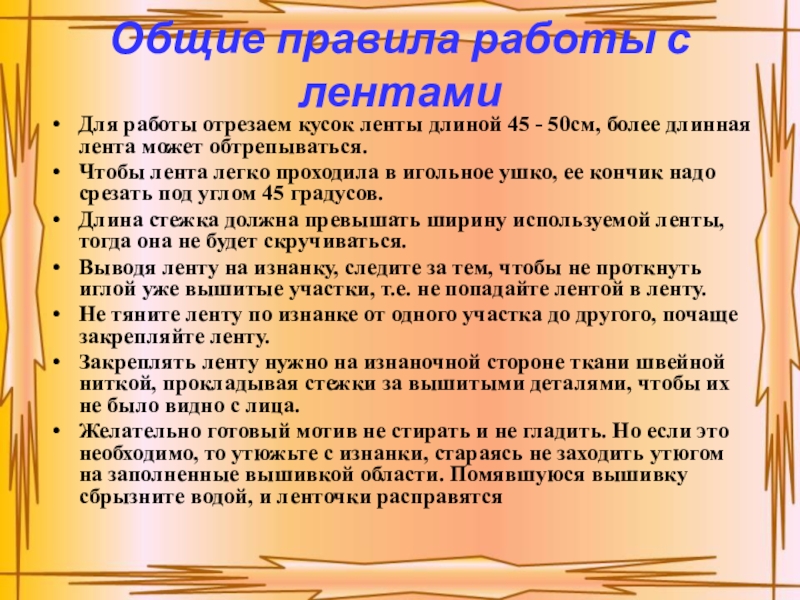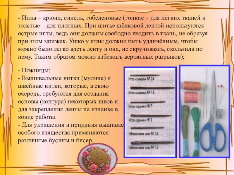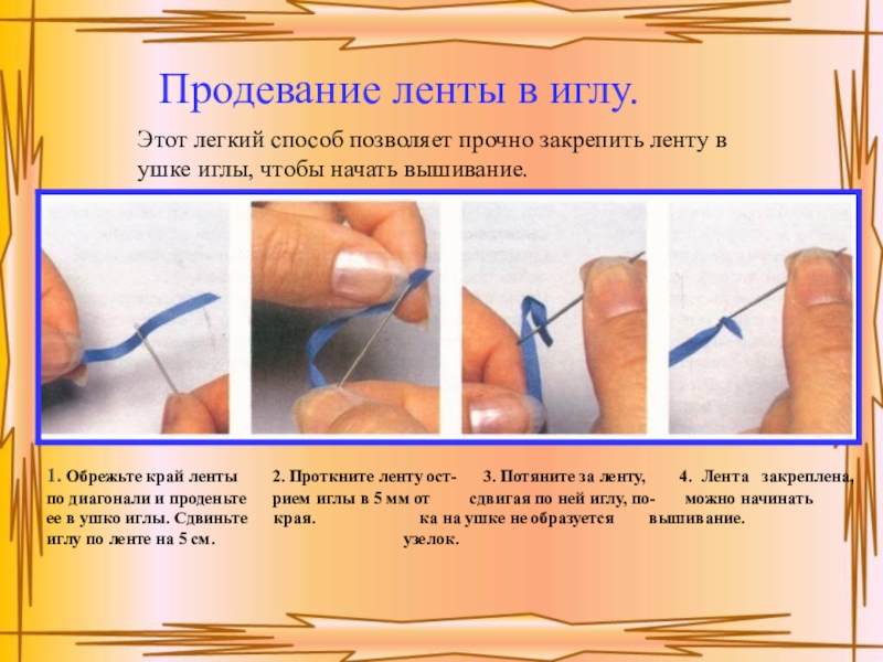 используются острые иглы, ведь они должны свободно входить в ткань, не образуя при этом затяжек. Ушко у иглы должно быть удлинённым, чтобы можно было легко вдеть ленту и она, не скручиваясь, скользила по нему. Таким образом можно избежать вероятных разрывов);