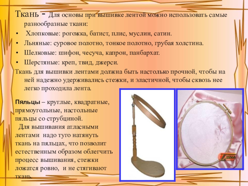 Слайд 19Ткань - Для основы при вышивке лентой можно использовать самые