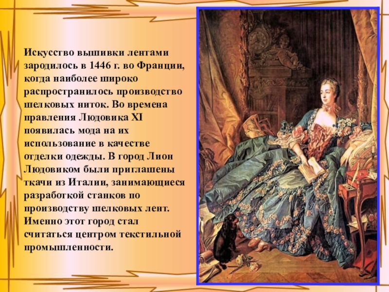 Искусство вышивки лентами зародилось в 1446 г. во Франции, когда