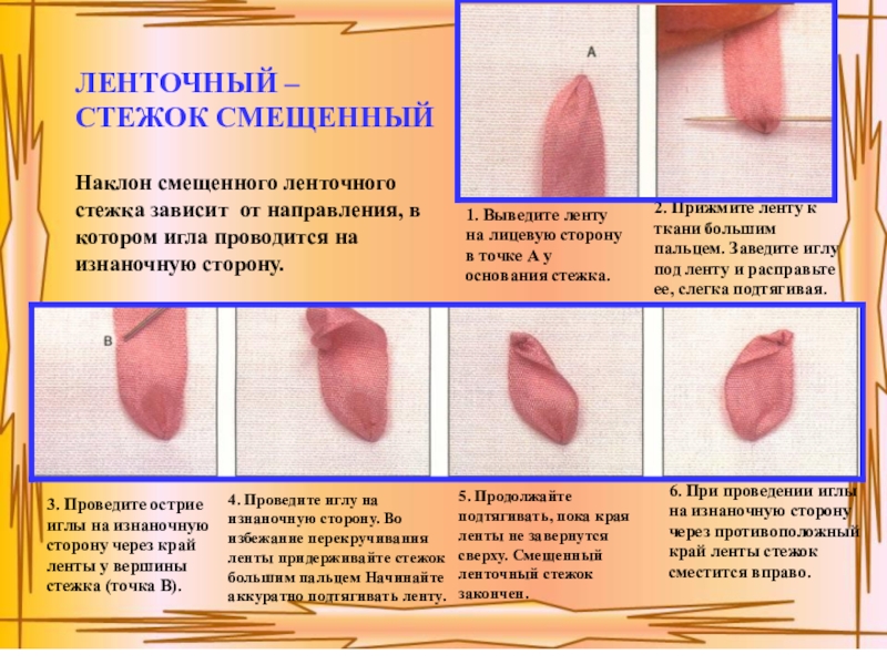 на изнаночную сторону через край ленты у вершины стежка (точка В).