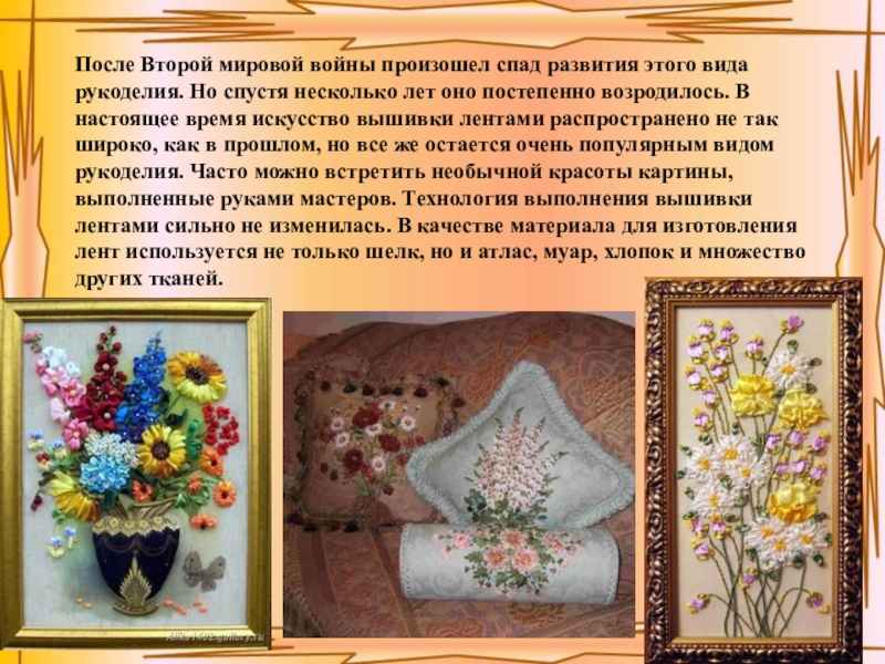 После Второй мировой войны произошел спад развития этого вида рукоделия.