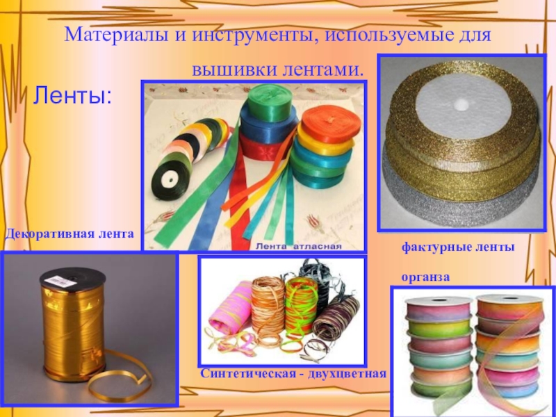 Слайд 18Материалы и инструменты, используемые для вышивки лентами.