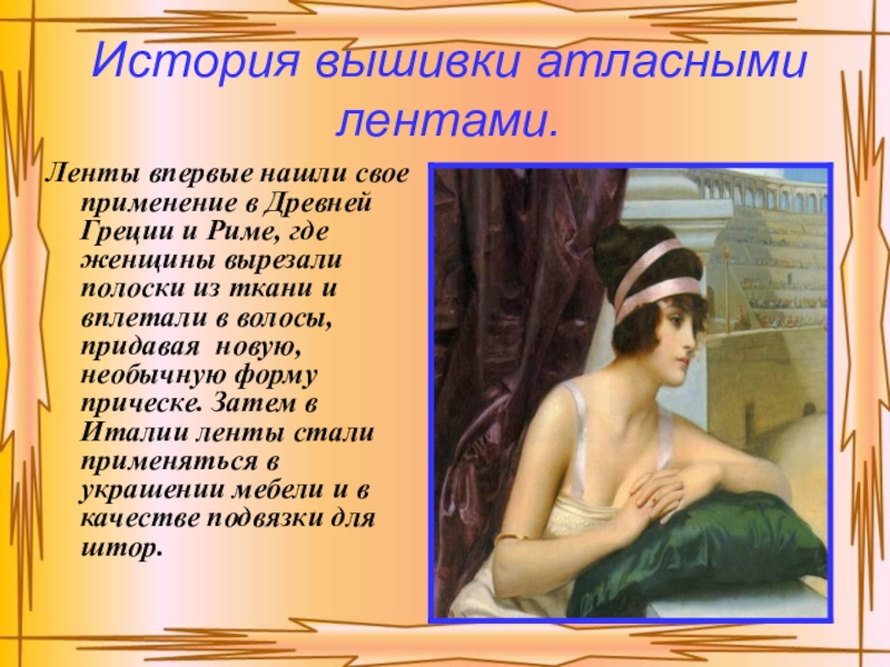 вплетали в волосы, придавая новую, необычную форму прическе. Затем в Италии ленты стали применяться в украшении мебели и в качестве подвязки для штор.