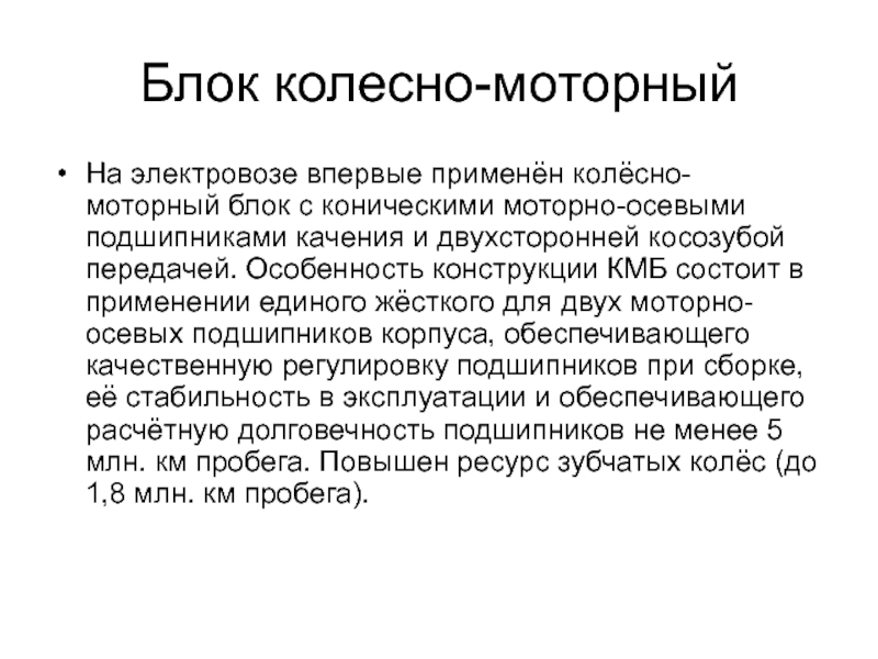 На электровозе впервые применён колёсно-моторный блок с коническими моторно-осевыми