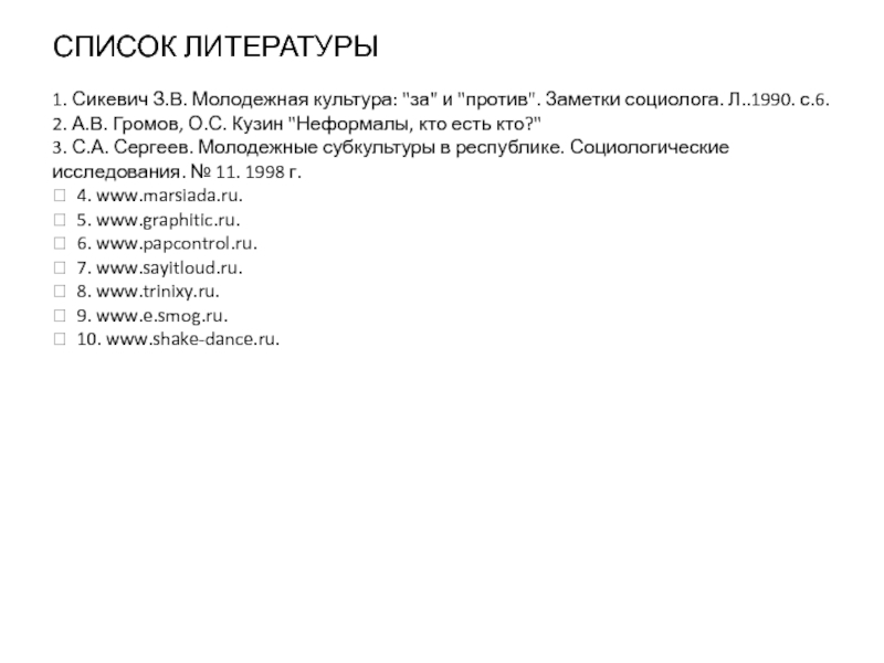 3. С.А. Сергеев. Молодежные субкультуры в республике. Социологические исследования. № 11. 1998 г.