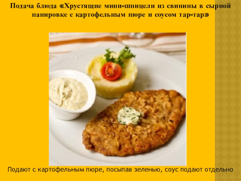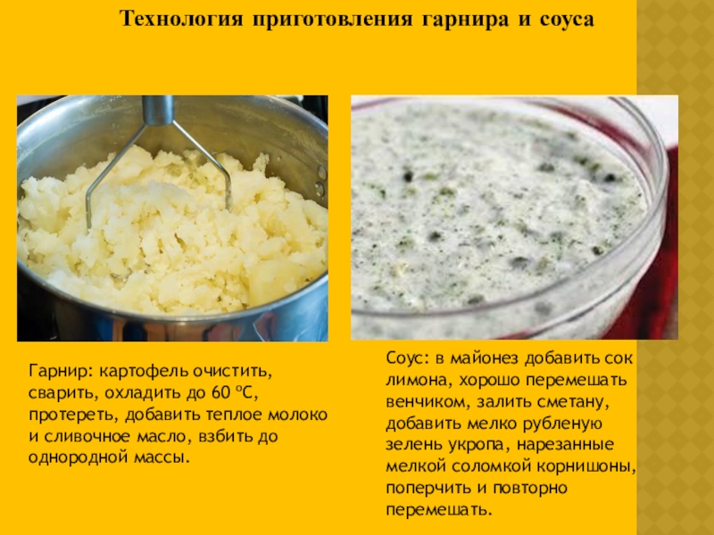 Соус: в майонез добавить сок лимона, хорошо перемешать венчиком, залить сметану, добавить мелко рубленую зелень укропа, нарезанные мелкой соломкой корнишоны, поперчить и повторно перемешать.