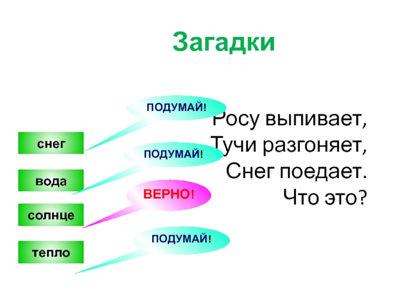 ЗагадкиРосу выпивает,Тучи разгоняет,Снег поедает.Что это?солнцеснегводатеплоПОДУМАЙ!ВЕРНО!ПОДУМАЙ!ПОДУМАЙ!