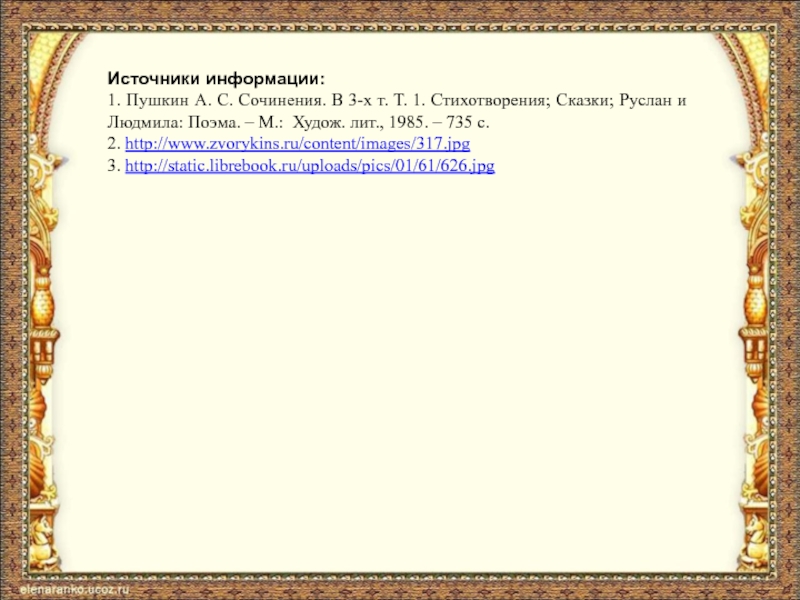 Источники информации:1. Пушкин А. С. Сочинения. В 3-х т. Т. 1. Стихотворения; Сказки; Руслан и Людмила: Поэма.